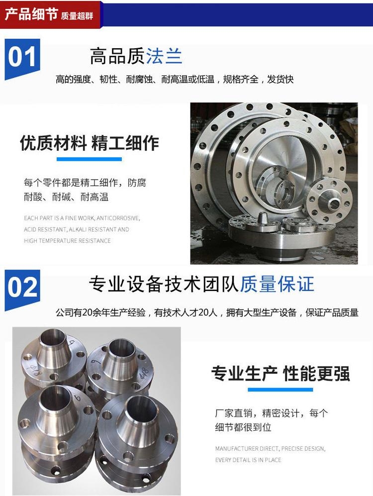 法兰又叫法兰凸缘盘或突缘。法兰是轴与轴之间相互连接的零件,用于管端之间的连接;也有用在设备进出口上的法兰,用于两个设备之间的连接,如减速机法兰。法兰连接或法兰接头,是指由法兰、垫片及螺栓三者相互连接作为一组组合密封结构的可拆连接。管道法兰系指管道装置中配管用的法兰,用在设备上系指设备的进出口法兰。法兰上有孔眼,螺栓使两法兰紧连。法兰间用衬垫密封。法兰分螺纹连接(丝扣连接)法兰、焊接法兰和卡夹法兰。法兰都是成对使用的,低压管道可以使用丝接法兰,四公斤以上压力的使用焊接法兰。两片法兰盘之间加上密封垫,然后用螺栓紧固。不同压力的法兰厚度不同,它们使用的螺栓也不同。水泵和阀门,在和管道连接时,这些器材设备的局部,也制成相对应的法兰形状,也称为法兰连接。凡是在两个平面周边使用螺栓连接同时封闭的连接零件,一般都称为“法兰”,如通风管道的连接,这一类零件可以称为“法兰类零件”。但是这种连接只是一个设备的局部,如法兰和水泵的连接,就不好把水泵叫“法兰类零件”。比较小型的如阀门等,可以叫“法兰类零件”。