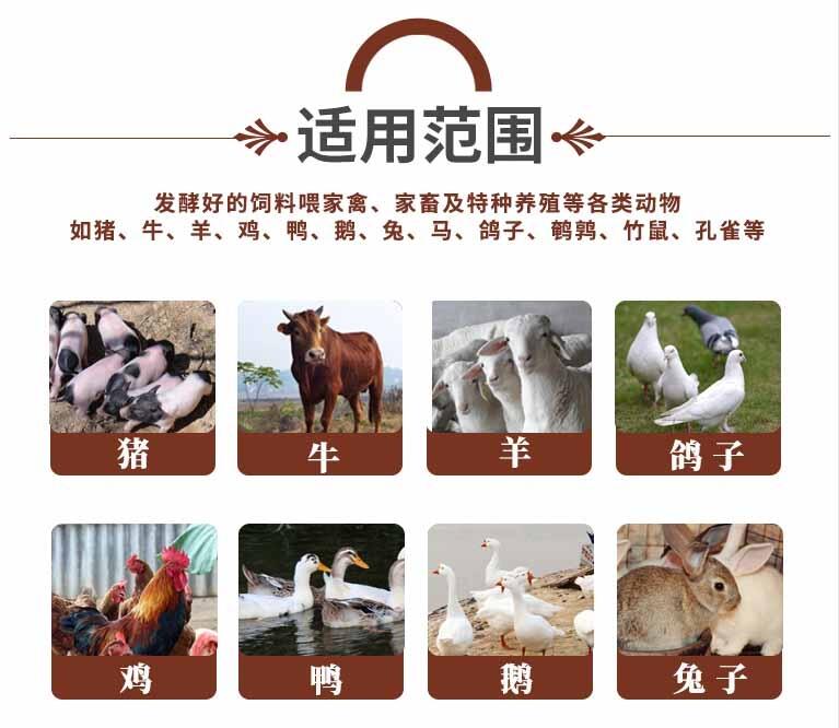 发酵后的饲料适用于家畜、家禽及虫类养殖领域,包括猪、鸡、鸭、鹅、牛、羊、马、兔、狗、狐、貂、鸽子、蚕等