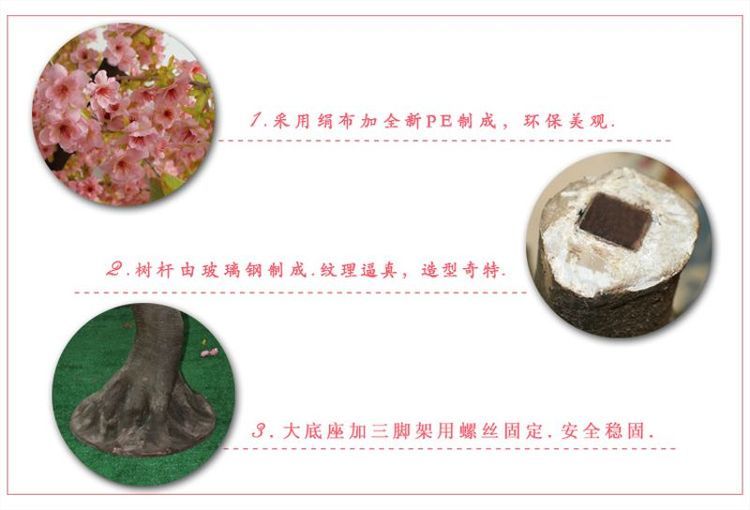产品材质:花朵:绢布 全新PE ?树杆:玻璃钢 钢结构/真杆 |