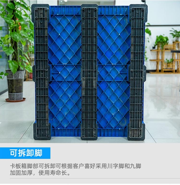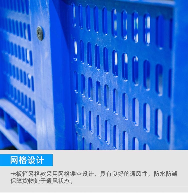 塑料卡板箱优势:  1。塑料卡板箱的使用寿命比木箱长约10倍左右。  2。塑料卡板箱比同类型木箱及金属箱重量轻很多,采用一体成型所以在搬运和运输中性能更好。