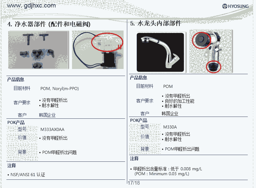 4、耐化学部件:散热槽端槽、洗碗机轴承、液压油封、搅拌机刀片支架、燃油泵外壳等;