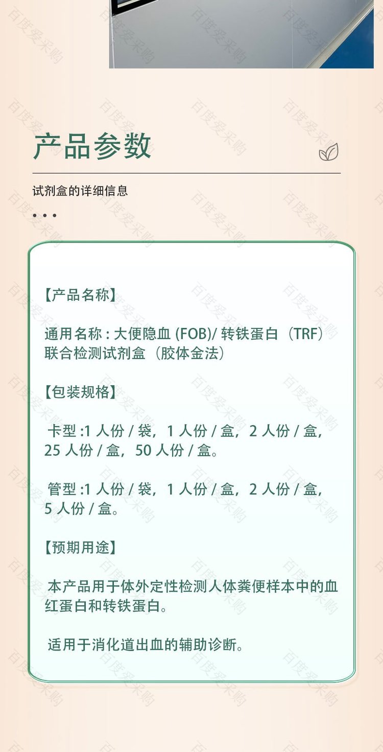 产品名称 | 大便隐血(FOB)/转铁蛋白(TRF)联合检测试剂盒(胶体金法) | ||