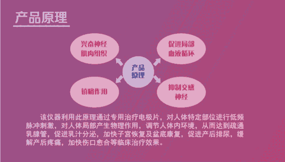 产后恢复治疗仪内置不同的程序模块,每一程序模块内存多种不同的输出脉冲,对不同部位产生不同的脉宽神经刺激,可引起运动神经及其支配肌肉的反应,使肌肉产生强直收缩,通过直接和反射作用扩张血管,改善组织血液循环及营养状况,促进产后功能恢复。