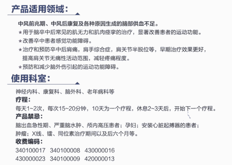 超声脑血管治疗仪可以单独使用,也可与溶栓药I物同时使用,提高溶栓治疗效果,减少出血并发症。在脑动脉硬化、脑血管狭隘(MRA或TCD异常)和TIA发作的脑梗死前期,该治疗可以消除动脉硬化斑块、扩张脑血管,提高细胞代谢水平,促进侧支循环建立。在脑卒中恢复期和康复过程中,本治疗可以溶解血栓,改善脑微循环,提高细胞代谢水平,促进侧支循环建立。结合电刺激疗法治疗,加强被动锻炼,防止肌肉萎缩,促进血液循环,使受损肢I体的运动功能得到康复,加快肢i体功能和语言障碍的恢复。