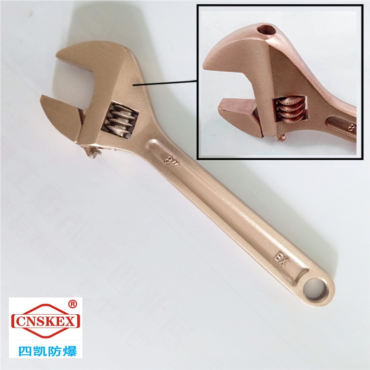 河北四凯防爆活动扳手:多用于拆装螺纹连接件,使用时应使其固定开口面受拉力,活动开口面受压力,不可反用。活动扳手的规格型号以柄长和大开口宽度(mm)表示。(柄长×大开口宽度)。其大小需根据螺栓(母)的大小通过中间的调整旋母进行调整