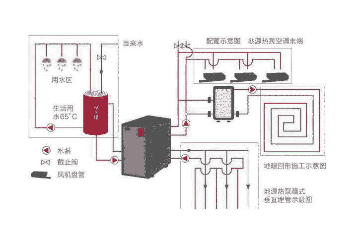 中动新能源 地源热泵是一套可以一机三用的中央空调系统。相比于一般的家用中央空调,因为系统组成不同,一般只能制热或者制冷,不带有生活热水功能。比如多联机中央空调,采用一拖多的形式为建筑制冷,其由于室内是氟系统,所以没有办法为室内提供地暖服务。而地源热泵不同,地源热泵不管是钻孔中的地埋管部分还是室内的末端部分,都是采用的水系统运行,所以系统的安装灵活度大,室内可以自由选择带空调、地暖、热水等系统。