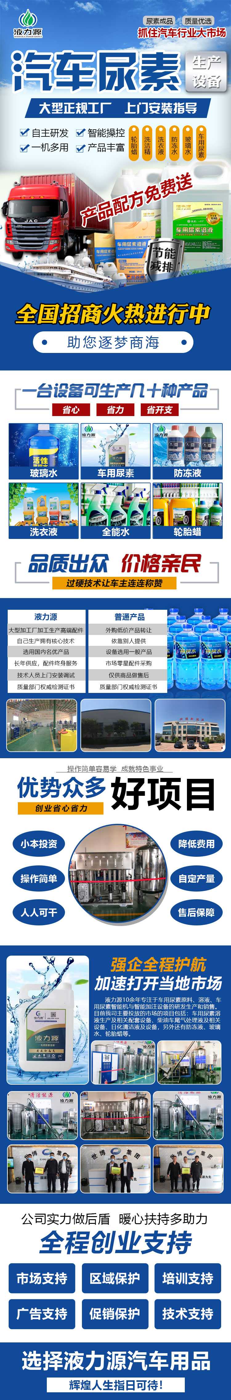 各地寻找想自主创业的合作伙伴,公司旗下拥有自己的旗舰品牌,多个注册商标。公司拥有一支先进的技术专员、管理精英与市场营销组成的核心的研发团队,公司借鉴国内外高端国六车用尿素技术为导向,先进的流水生产线, 公司主要生产汽车防冻液设备、玻璃水设备、车用尿素设备、洗车液设备、全能水设备、轮胎蜡设备、洗化日化用品设备工业尿素设备、脱硫脱硝设备等。