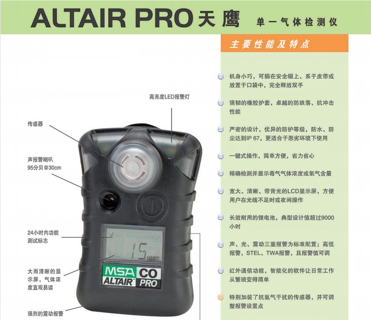 梅思安天鹰Altair pro便携式单一氧气检测仪,轻巧的机身具有良好的抗摔性能,小巧的体积能够轻松的插在安全帽上、系于皮带或放置于口袋中。长效电池能够提供典型超过9000小时的工作时间,检测 ,