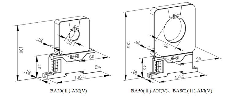 智能型BA系列电流传感器应用电磁感应原理,对电网中的交流电流进行实时测量,采用恒流和线性补偿技术,将其隔离变换为标准的直流信号输出,或通过 RS485 接口(Modbus-RTU 协议)将测量数据进行传输。DC24V 或 12V 安全电压供电,可广泛用于工业自动化领域。BA50L(Ⅱ)-AI 为交流剩余电流互感器,主要检测用电系统的漏电流,能随时掌握电气线路和设备的情况,防止因漏电而发生的火灾等事故。