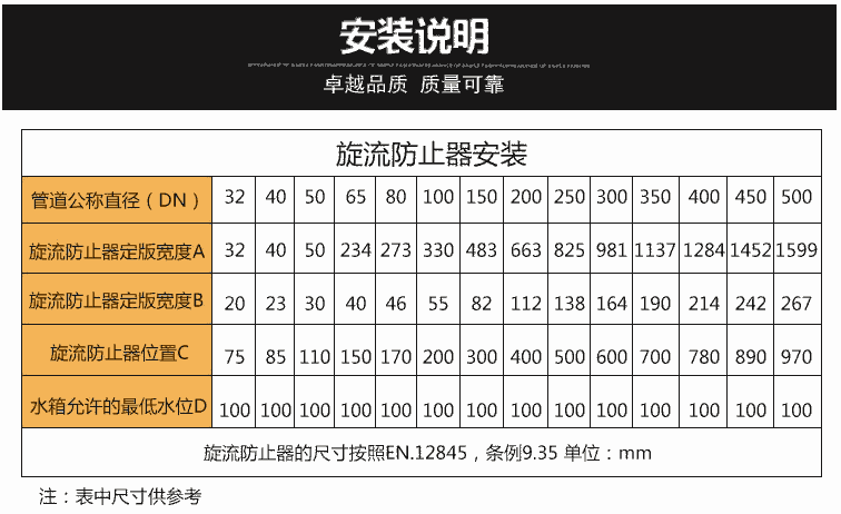 1.旋流防止器是按照欧盟标准EN12845的标准设计与制造,最低淹没深度可至100mm而不产生旋流,大大提高了水池的有效利用率。