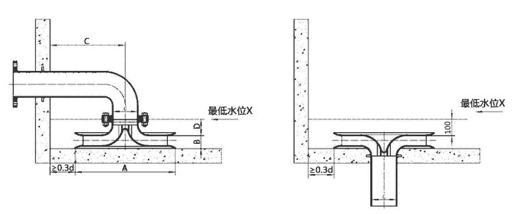 3.安装要求:旋流防止器的外缘与水池池壁应至少留有0.3d的间隙,d为吸水道的公称尺寸。