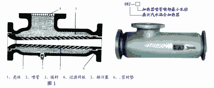 2、该产品结构如图1所示,工作时被加热水通过呈拉阀尔管形的喷管,蒸汽从喷管侧通过管壁上的许多斜向小孔喷入水中,二者在高速流动中瞬时良好混合,达到加热水的目的。通过加热器一次性加热后,热水直接送往浴池热水箱及其它生活用水的场合,称为单向开式系统