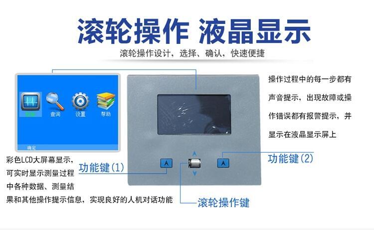 彩色LCD大屏幕显示,可实时显示测量过程中各种数据、测量结果和其他操作提示信息,实现良好的人机对话功能。
