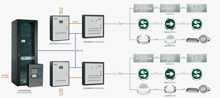分配电装置可安装于电源柜边,也可独立设置于各个楼层,为终端应急灯具提供DC24V电源,以及为系统控制信号提供承载和中继功能,具体体现在: