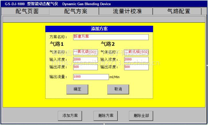 一个配气方案括选择气路、输入浓度、输出浓度、输出流量四个参数,用户可以参考仪器自带的方案,做自己特定的配气方案。