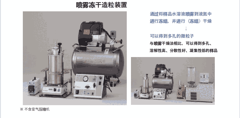 在药物研究及DDS(给药系统)研究领域的需求,一般的干燥手段(喷雾干燥)得到的具有药用成分的细粉希望可溶于水。喷雾干燥法得到的细粉会凝集成“块”,会产生不溶于水的部分。超过100℃以上的温度会使其进行局部分解,使药效减半。