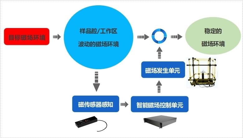 通过三分量磁场传感器实现杂散磁场的感知,并将感知到的信号送入智能磁场控制单元;智能磁场控制单元实时产生一个电流信号,该电流通过磁场产生单元产生与杂散磁场方向相反、大小相等的磁场,在工作区实现了磁场的叠加从而得到稳定的磁场环境。