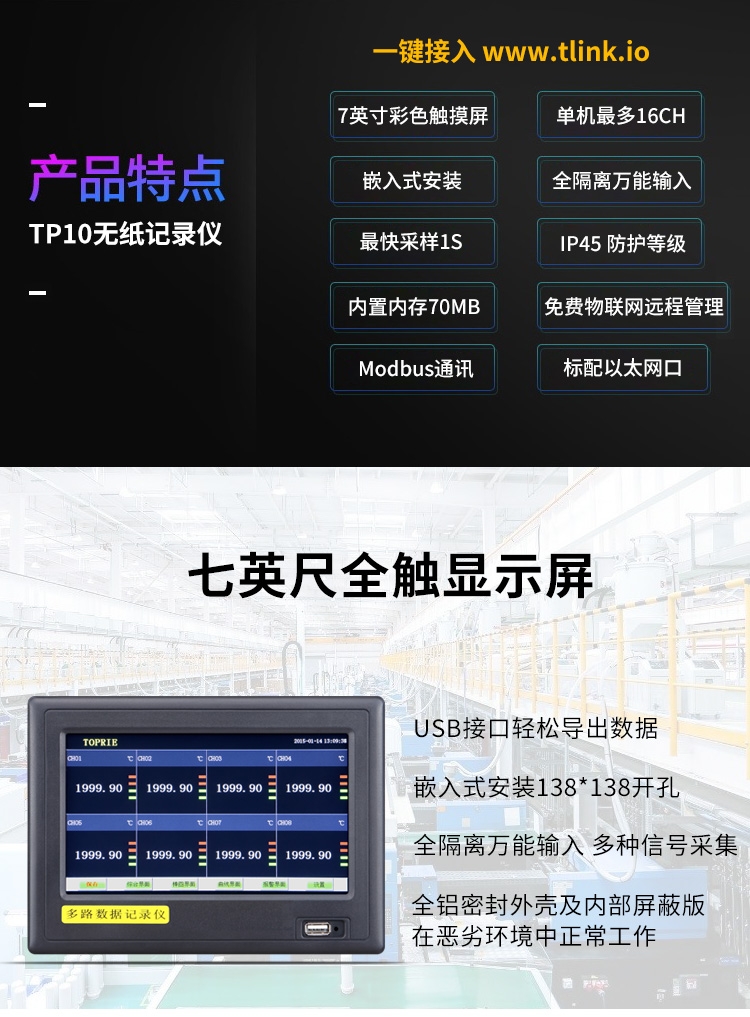 TP710无纸记录仪配免费物联网平台实现IE远程监控,手机查看数据,微信报警功能,采用标准MODBUS通讯协议。应用于农业、电力、气象、交通、环保、各类工业等智慧物联网领域。