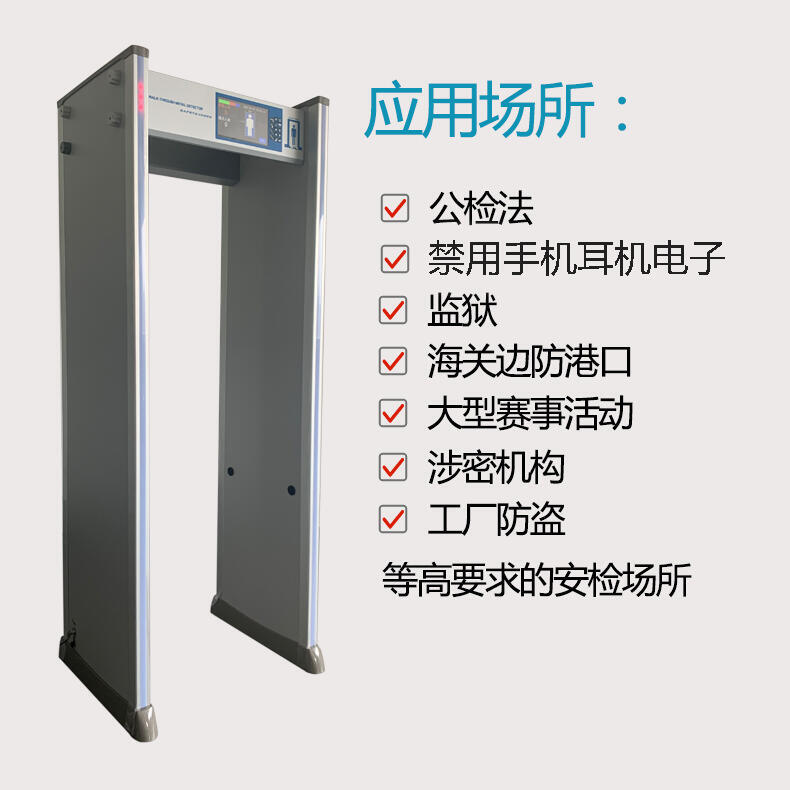 该款高性能手机门具有以下优点:多方向无盲区探测;探测灵敏度较高;抗干扰能力强;多个探测区域,每个区域都可以单独设置灵敏度:自诊断程序,上电自检:10.11寸大液晶电容屏;采用高强度材料,能防火,防腐蚀,防震等;可以实时监视的背景环境干扰。新一代多维度智能分类探测手机门,是为满足级别安检要求场所而设计。广泛应用于部队、机关、保密单位、公、检、法、、学校、考试院等领域的保密单位要求等。具有灵敏度高、稳定性强、准确性好、可调范围广、安装简便、功耗低、使用寿命长等特点。能快速一键式排除在排除被检测人员日常携带物品(钥匙、手表、皮带、眼镜、香烟、火机、皮鞋、雨伞、扳手等)的基础上,该探测系统可探测到处于开机或者关机状态(含移除电池、移除SIM卡)的手机、电子产品并进行定位 具有极高探测能力。