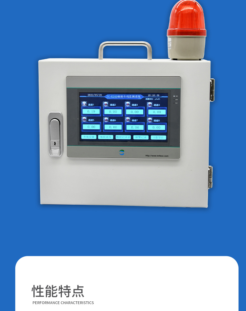 ZC-R200 在线辐射监测系统是以盖革弥 (GM-TUBE)为监测核心的辐射监测仪,多种规格的传感器可选,监控终端可选择 1-16 个传感器,用于同时测量多个区域的辐射并记录各种数据,方便的 USB 接口导出数据以便分析和考核。监控终端是一个 7 寸触控数据采集器,内置存储,可设置的报警阀值,标配声光报警装置;同时输出 RS232 ,协议modbus-rtu 协议。该仪器广泛应用于放射性废物库、工业无损探伤、CT 室、医院γ刀治疗、同位素应用、 γ辐照、医院 X 射线诊断、钴治疗、核电站、海关等以及可能存在放射性的场所;时刻帮助工作人员了解放射源或射线装置已处于工作或泄漏状态,以保证人员的健康和安全。
