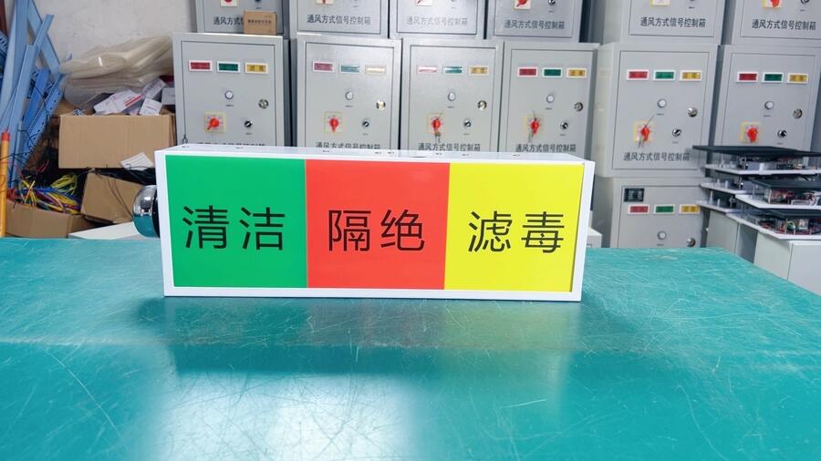 通风方式信号灯箱用于工程掩体内部空气质量状态的显示和报警,主要对三种空气质量情况进行报警:清洁、隔绝、滤毒。灯箱分别用三种颜色的灯光来对三种不同空气情况报警:清洁——绿色灯光;隔绝——红色灯光;滤毒——黄色灯光。