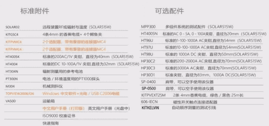 I-V500w 是为太阳能光伏系统进行日常的和定期维护的***解决方案。通过I-V500w,来查找太阳能光电系统中的组件 缺陷和问题会变得非常迅速,并更加有效而直接。I-V500w是用于测量单个太阳能光电模组或电池串的I-V特性的的主 要性能参数。该仪器可以测试装置的I-V特性,还能测试组件的温度和外部环境的温度,同时测量太阳能辐照功率, 因此仪器可以把现场测试的数据,按国际通用的经验公式换算出组件在STC标准状态下的I-V曲线数据,仪器通过测 试所获取的数据推测太阳能模组的I-V特性,并与标准单元的测试数据一起,与厂家所提供的数据进行比较,成而可 以立即对单个模组或电池串的性能进行判断是否符合要求。 仪器还可以把现场测试的数据保存到内置的数据存储器, 有效期通过***的Windows软件下载到个人电脑,以便测试人员可以对测试数据进一步分析,并出具测试报告. I-500w通过4端测试方法来测量模组或电池串的输出电压和电流,当在需要延长测试线以完成测量时不需对测试线进 行补偿。而能进行准确的测量。在仪器的内置存储器上,管理有一个太阳能电池组伯的数据库,且可通过管 理软件和仪器直接进行更新,因此在进行测试组件的I-V特性和通过标准模块推测I-V特性,I-V500w将完成测试值与 厂家公布的标称值进行比较判断,从而给出OK/NOT OK的测试结果。测试人员不需要进行任何的计算,无需任何复杂 的操作,仪器可以快速、自动的给出测试结果。