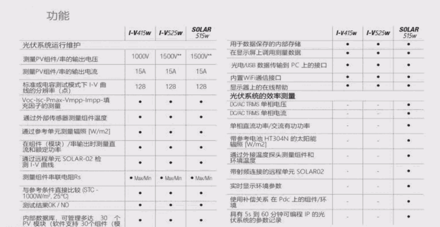 I-V500w 是为太阳能光伏系统进行日常的和定期维护的***解决方案。通过I-V500w,来查找太阳能光电系统中的组件 缺陷和问题会变得非常迅速,并更加有效而直接。I-V500w是用于测量单个太阳能光电模组或电池串的I-V特性的的主 要性能参数。该仪器可以测试装置的I-V特性,还能测试组件的温度和外部环境的温度,同时测量太阳能辐照功率, 因此仪器可以把现场测试的数据,按国际通用的经验公式换算出组件在STC标准状态下的I-V曲线数据,仪器通过测 试所获取的数据推测太阳能模组的I-V特性,并与标准单元的测试数据一起,与厂家所提供的数据进行比较,成而可 以立即对单个模组或电池串的性能进行判断是否符合要求。 仪器还可以把现场测试的数据保存到内置的数据存储器, 有效期通过***的Windows软件下载到个人电脑,以便测试人员可以对测试数据进一步分析,并出具测试报告. I-500w通过4端测试方法来测量模组或电池串的输出电压和电流,当在需要延长测试线以完成测量时不需对测试线进 行补偿。而能进行准确的测量。在仪器的内置存储器上,管理有一个太阳能电池组伯的数据库,且可通过管 理软件和仪器直接进行更新,因此在进行测试组件的I-V特性和通过标准模块推测I-V特性,I-V500w将完成测试值与 厂家公布的标称值进行比较判断,从而给出OK/NOT OK的测试结果。测试人员不需要进行任何的计算,无需任何复杂 的操作,仪器可以快速、自动的给出测试结果。