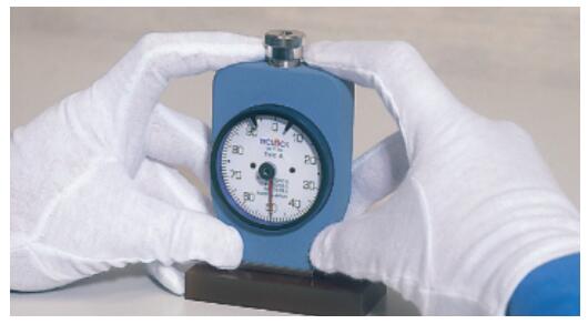 用手动测橡胶硬度时,将硬度计放在工件上的表面上,以正常的速度直接下压使橡胶硬度计的压力面贴合于工件表面并直接读取橡胶硬度计指针的读数即为橡胶硬度值。