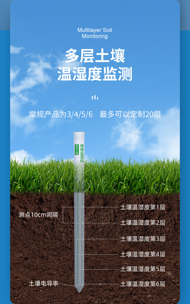 管式土壤墒情监测仪是一款基于介电常数原理而研发的传感器,可以针对不同土层的水分、温度含量进行快速、准确、全面监测。该传感器监测层数支持定制,可测三层土壤温湿度,高可测十层土壤温湿度。