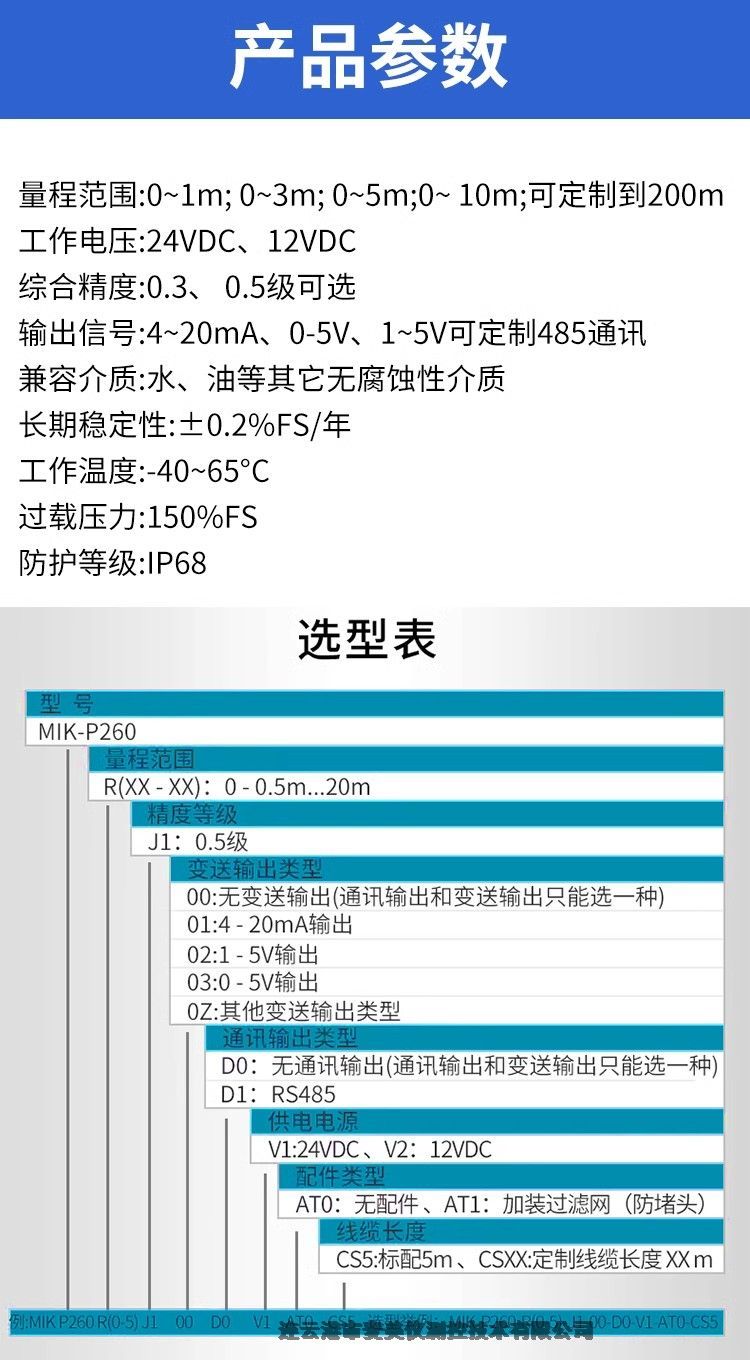 美控MIK-P260投入式液位变送器4-20mA一体式水位计0-5m物位探头