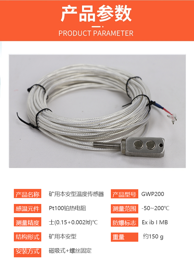 现代矿用设备强调快速安装和易维护,GWP200温度传感器采用磁吸式探头设计,当环境设备温度需要检测时,只需将传感器探头靠近需测温表面即可实现稳固吸附。磁吸特性不仅简化了安装步骤,避免钻孔或焊接破坏设备表面,还能在维护时轻松拆卸,减少设备停机时间。