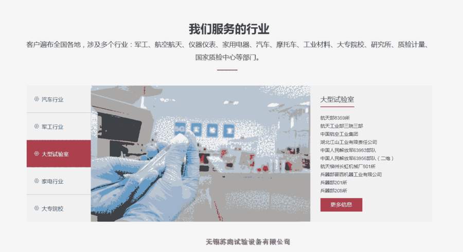 公司主导产品:汽车环境仓、汽车环境舱、汽车整车环境试验室、汽车低温冷启动试验室、汽车空调环境试验室、汽车淋雨试验室、汽车淋雨房、固化炉、盐雾腐蚀试验箱、高低温交变湿热试验箱、淋雨试验箱、砂尘试验箱、臭氧老化试验箱、步入式盐雾试验室、步入式高低温试验室、步入式淋雨室、步入式砂尘试验室、氙灯耐气候试验室等相关试验系列,客户遍布全国各地,涉及多个行业:仪器仪表、家用电器、汽车、摩托车、工业材料、大专院校、研究所、质检计量、国家质检中心等部门。主要用户如:兵器部轻武器检测中心、总装备部汽车试验场、国家飞机材料检测中心、中国飞机强度研究所、、兵器部201所、203所、204所、207所、208所电子4所、36所、22所、53所、中船722所、704所、723所、725所、中国航空总公司第605所、611所、613所、湖北江山工业集团公司、海南汽车研究所、中国汽车工程研究院、国家汽车材料产品质检所、国家汽车灯具质检中心、奇瑞汽车、东风本田、上海大众、法雷奥车灯、上海海拉电子、中国重汽集团、中国电力院、东洋机电、联想,华硕,科龙、华宝、威力、惠尔浦、美的、华凌、东宝、汇丰、春兰、美菱、荣事达、 博西威、无锡松下冷机,中意、万和、格力、海信、海尔、奥柯玛、新飞、康佳、奥克斯、新科、上菱天安、风华以及小家电企业:万和、格兰仕,康宝,神州,苏泊尔,帅康、华帝;外资厂商如:西门子、LG、松下、夏普、三星、比亚迪、上海华普,天津汽研所、东南汽车、长丰汽车、江西昌铃汽车、济南重卡、春兰汽车、浙江嘉利、镇江汽车制造厂、广州客车厂、海南马自达、北京福田汽车、北京欧曼重型汽车、浙江毫情汽车、天津一汽夏利汽车股份、聊城中通客车,北京海拉车灯、天盛车灯、秦川车灯/西门子威迪欧汽车电子、台州轩金车灯、武汉法雷奥、上海法雷奥、河南鹤壁天海电器、沈阳华晨、沈阳天海电装,重庆长华、烟台霍富锁厂、北京北重、襄樊达安汽车检测中心、秦皇岛戴卡轮毂、三门峡戴卡、无锡戴卡、南海中南轮毂、、沈阳三花轮毂、宁波跃进汽车、采埃孚富奥底盘、总装备汽车试验场、重庆中南铝合金轮毂、北京佩特来电器、大连柴油机,玉林柴油机,无锡柴油机,新昌柴油机,常州柴油机厂。