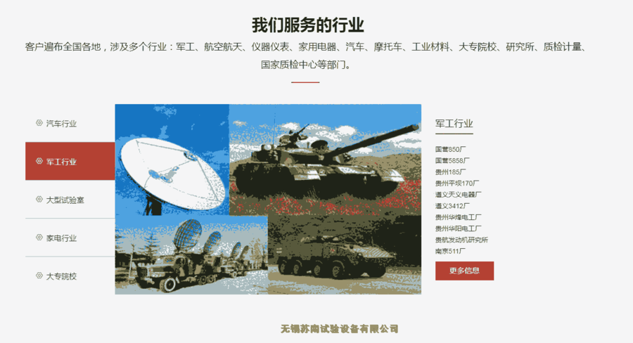 公司主导产品:汽车环境仓、汽车环境舱、汽车整车环境试验室、汽车低温冷启动试验室、汽车空调环境试验室、汽车淋雨试验室、汽车淋雨房、固化炉、盐雾腐蚀试验箱、高低温交变湿热试验箱、淋雨试验箱、砂尘试验箱、臭氧老化试验箱、步入式盐雾试验室、步入式高低温试验室、步入式淋雨室、步入式砂尘试验室、氙灯耐气候试验室等相关试验系列,客户遍布全国各地,涉及多个行业:仪器仪表、家用电器、汽车、摩托车、工业材料、大专院校、研究所、质检计量、国家质检中心等部门。