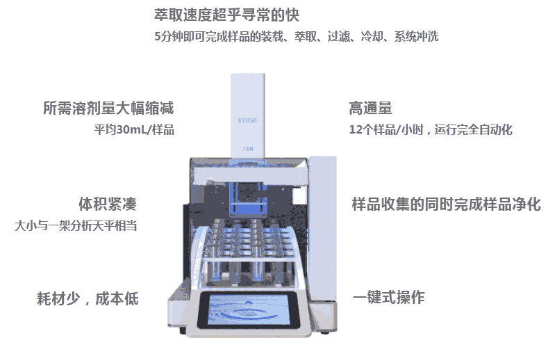 符合US EPA 3545、AOAC2007.01、HJ783-2016等加压流体萃取标准,特别适用于环境土壤和沉积物、固体废物、PUF中的半挥发性有机物的提取,食品中农药残留的提取,以及塑料制品的成分提取,受样品基体影响小,可以提取固体、半固体、含水分的样品。