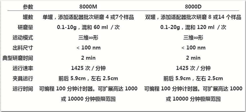 SPEX8000M/D系列高能球磨仪,美国行业标准,du家专利的∞式三维运动模式,在zui短的时间内向样品输送zui高的机械能量,为目前世界上所有球磨仪中能量zui高速度zui快的球磨机机种。SPEX以其在球磨机研发和生产59年的经验以及在球磨机创新领域所做出的突出贡献,成为美国球磨机行业标准的制定者。