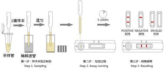 3、将检测卡平放,用滴管吸取裂解后的待检样本溶液,滴加2滴于加样孔中,,开始计时,结果应在5~15分钟读取,其他时间判读无效,根据示意图判定结果。
