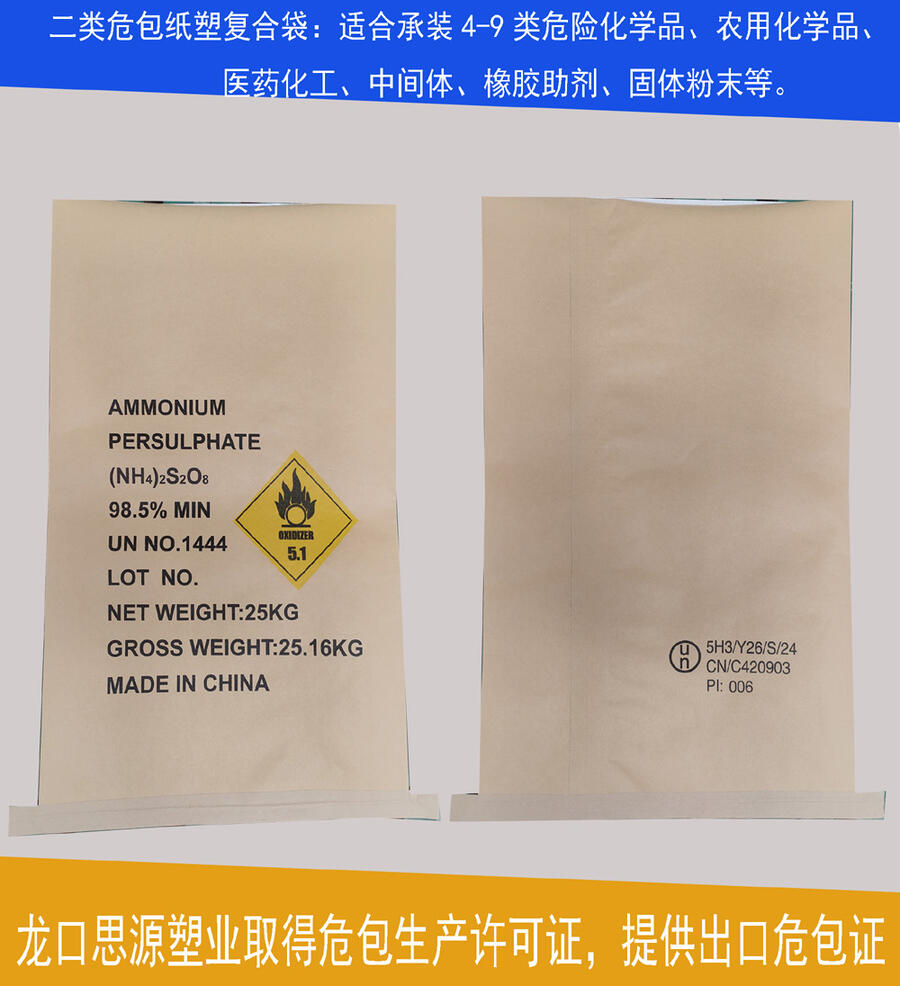 采用pp塑料编织袋与OPP 、珠光膜复合而成,具有强度高、耐冲击、防潮、抗滑性好,可加内膜袋,特殊规格可根据客户需求定制。适合承装原药、农药、中间体、塑料原料、砂浆、饲料、建材、包装运输、危险化学品、精细化工产品、种子、矿粉、复合肥料、纳米材料等。