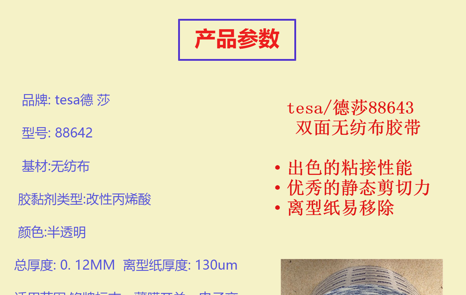 德莎88643棉纸双面胶带 德莎无纺布双面胶 皮革装饰件背胶