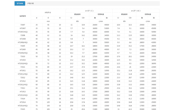 型号共分为:α=15°的角接触球轴承(70000C型); α=25°的角接触球轴承(70000AC型)。