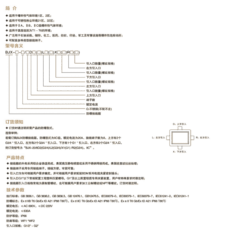 执行标准:GB38361、GB 38362、GB38363、GB 12476,1、GB124765、IE060079-0、IEC60079-1、IEC80079-7、IECS1241-0、IEC61241-1防爆标志: Ex d IB T6 GbEX ID A21 IP66 TBO'℃、 Ex d IC T6 GbEx ID A21 IP66 T8O℃, EX @ I T6 GbEX ID A21 IP66 TBOC额定电压:KAC690V,EDC220V
