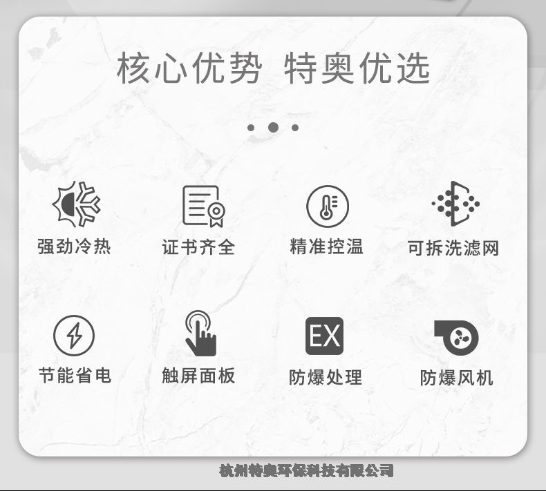 杭州特奥环保科技有限公司防爆空调系列机型通过特殊的技术加工工艺处理,可广泛应用于1区,2区防爆级别,涵盖国防、科研、石油、化工、医药、加工制造、生物制药等多种行业,为存在或可能存在ⅡA、ⅡB级,T1~T4组可燃性气体、蒸汽与空气混合形成的易引发爆炸的危险场所,并有温度控制要求场所设计的特种调温空调设备,改系列产品均通过国家防爆电气产品质量监督检测中心检验,获得国家防爆电气设备防爆合格证,防爆空调外形美观,设计合理并具有安装维修方便等特点,全系列防爆产品内部采用名牌压缩机、微电脑控制、数字显示,具有噪音低、性能稳定、操作简便等优点。深受广大特需行业客户喜爱。