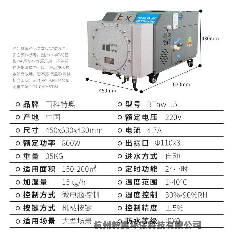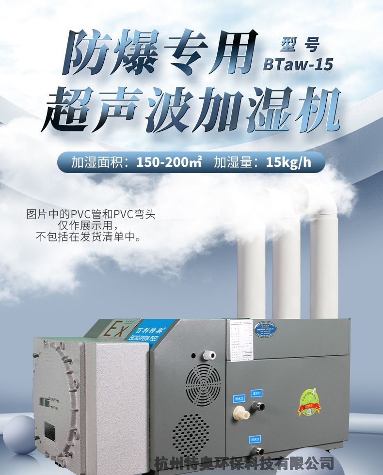 防爆加湿机,防爆超声波喷雾加湿机,防爆加湿机BTaw-15,生产厂家通过特殊防爆技术加工处理,可广泛应用于1区,2区防爆级别,涵盖国防、科研、石油、化工、医药、加工制造、生物制药等多种行业,为存在ⅡA、ⅡB级,T1~T4组可燃性气体、蒸汽与空气混合形成的易引发爆炸的危险场所,并有湿度控制要求场所设计的特种加湿设备,