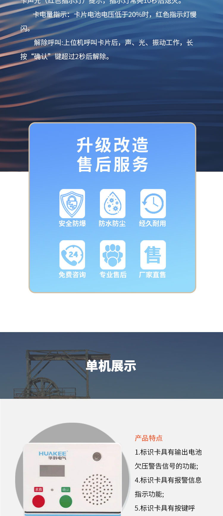 用于持卡人身份识别,同时附带上传卡的工作参数,包括卡号、电量信息、按键求救等信息。可按呼救键进行呼救,可按确认键解除地面呼叫信息。