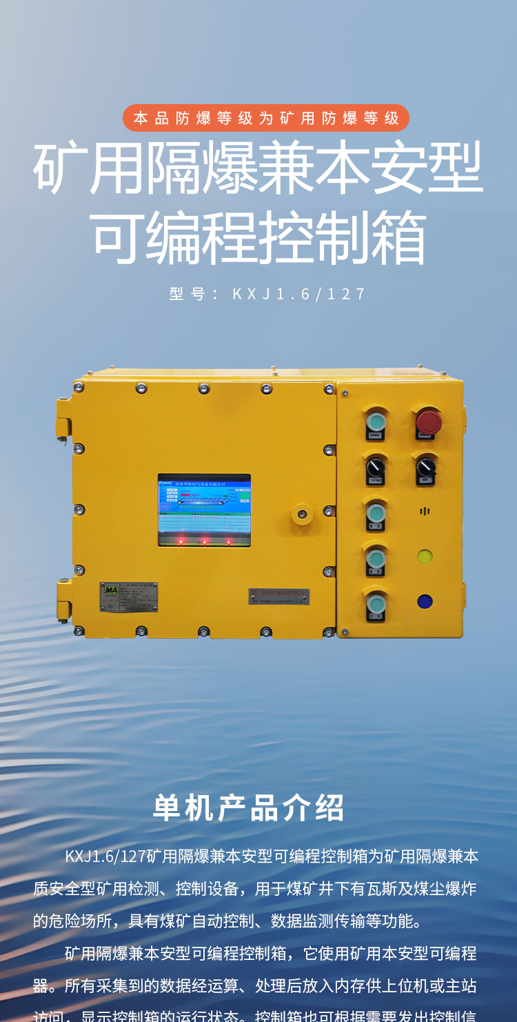 KXJ1.6/127矿用隔爆兼本安型可编程控制箱为矿用隔爆兼本质安全型矿用检测、控制设备,用于煤矿井下有瓦斯及煤尘爆炸的危险场所,具有煤矿自动控制、数据监测传输等功能。