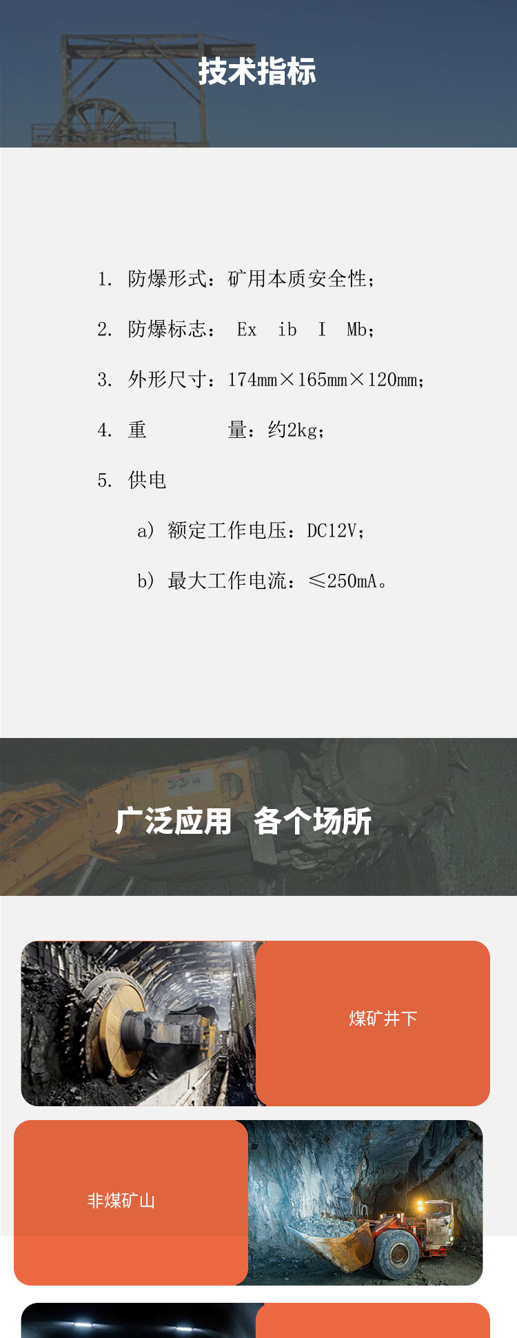 本激光发射器适用于有瓦斯、煤尘爆炸危险的煤矿井下、露天煤矿、选煤厂等工作场所,选用本安型电源供电。