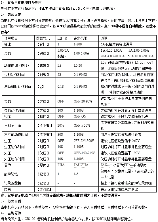 ●过载 ●堵转 ●短路 ●欠载 ●相序 ●三相不平衡 ●缺相 ●过压 ●欠压 ●五次故障记忆 ●复位方式可选●过载动作时间定时限反时限通用