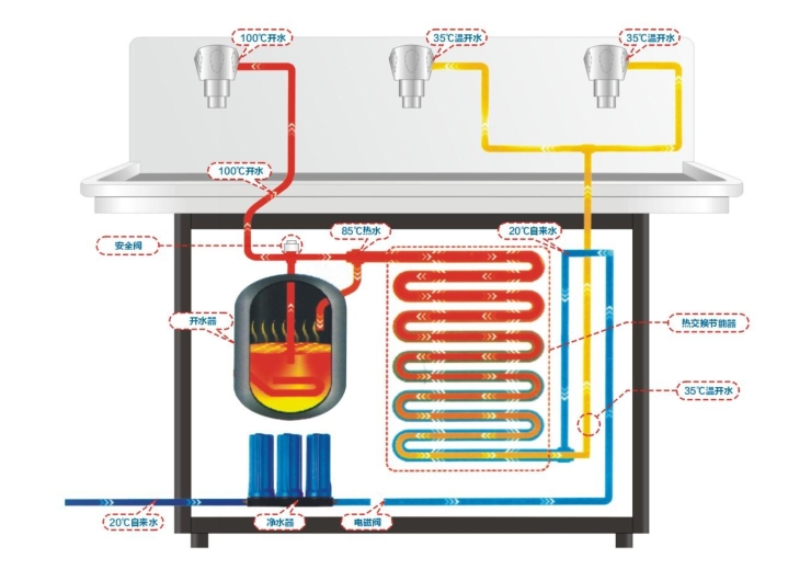 其中温开水技术是节能饮水机的另外一个应用,该产品的节能原理为利用对流热交换原理。当开水流经热交换器时,开水与冷水进行热能交换,开水释放热能,冷水吸收开水的热能,从而使冷水在进入水胆之前预热制80℃~85℃,而开水则变成温开水经水龙头流出来。此时要将冷水烧开就只需将它加热20℃~15℃即可,这样同时节省了电能和烧水时间,达到了节能目的。