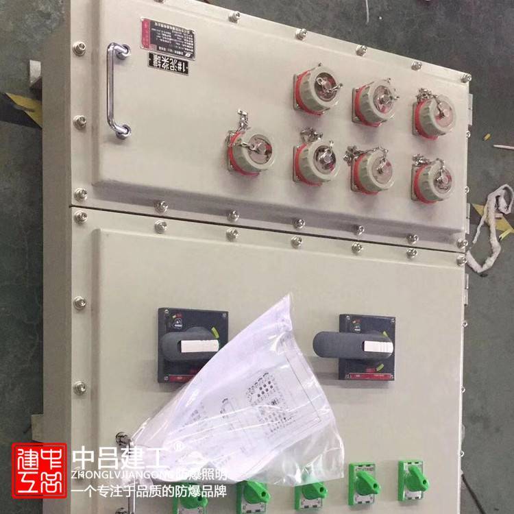 总开关配置:C65或CM1支路开关配置:2P或3P C65系列开关以及各种带漏电保护功能。CM1等塑料外壳式断路器母线腔配置:内部设有母线和防爆指示灯。接线腔配置:接线腔设置的接线端子为TC系列或UK系列。引入口配置: 引入装置规格为G1/2″-G3″,并可根据要求进行