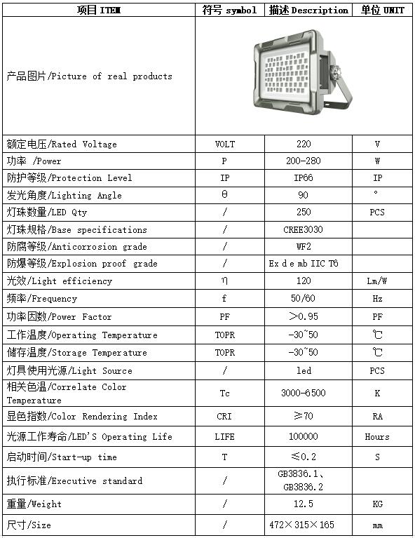 1、灯具结构组成:灯具壳体(铝合金其厚度低于六毫米)、电气箱(有隔爆面,出线孔采用环氧树脂封堵)、散热片(分布密度、厚度根据科学设计 反复试验)、玻璃透镜(不低于10毫米钢化玻璃)、外部禁锢螺丝(直径不小于6mm)、密封垫圈(硅胶密封垫圈);