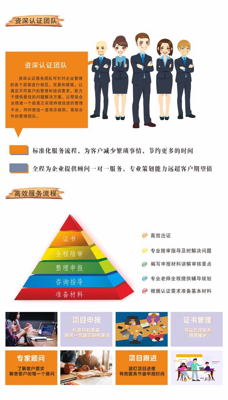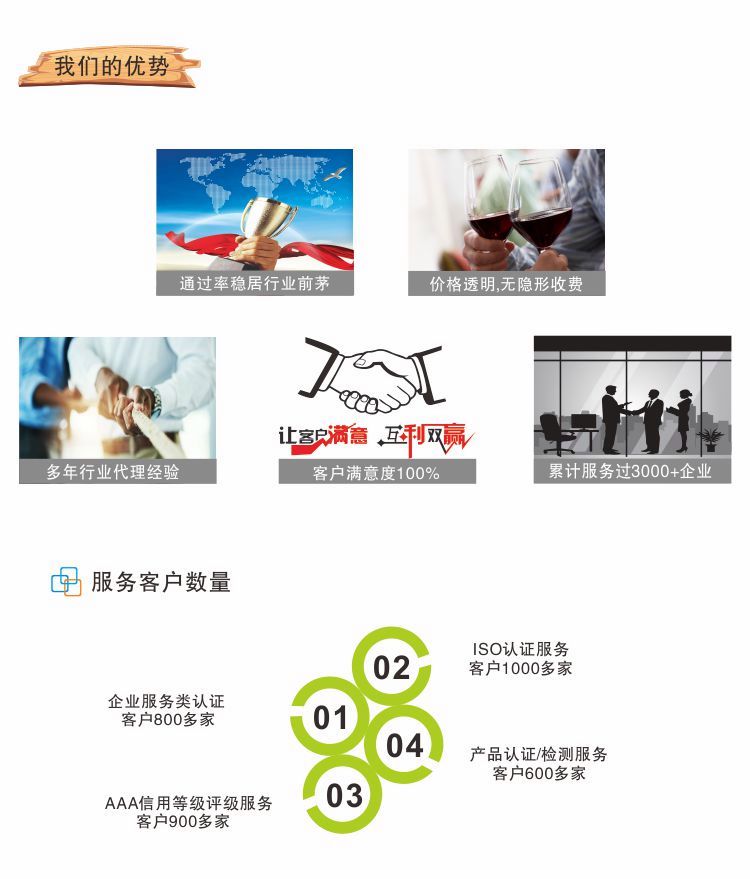 我司专注于企业认证咨询一体化服务,提供iso9001、iso14001、ohsas45001、haccp、iso22000等管理体系认证咨询和有机产品、中国绿色食品认证咨询、CCC认证、建筑企业资质新办、增项、升级的咨询机构。 公司还涉及科技项目咨询申报、知识产权顾问、商标、高新技术企业等代理申报和企业形象策划、企业管理培训,在省内享有较高的声誉,得到广大客户的信赖与支持。公司将一如既往继续努力,本着“诚信、专业、、高效”的宗旨为广大客户服务! 客户的要求是我们的服务之本,不断满足客户的要求并超越客户的期望是我们不断进步的动力,臻赞企业将和您一起迎接这充满挑战的市场,使我们的新老客户永远保持竞争的优势!